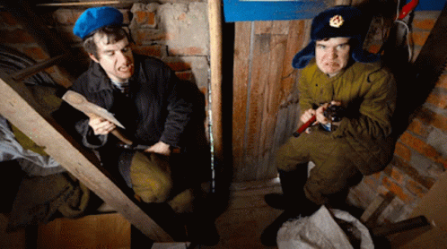 Контентын тайлбар: a man in a military uniform is holding a hammer and another man is holding a saw