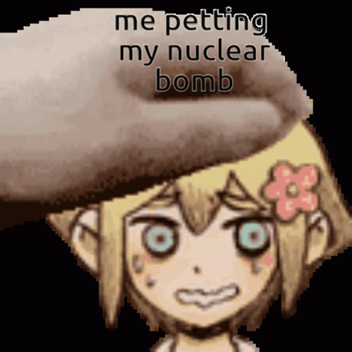 Контентын тайлбар: a pixel art of a girl with the words me petting my nuclear bomb written above her head