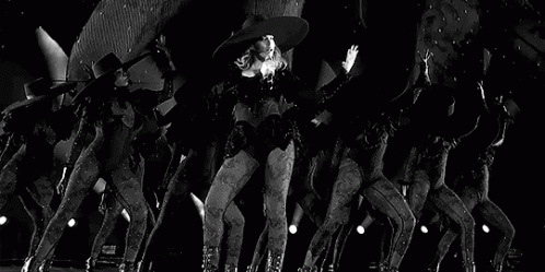 Контентын тайлбар: a black and white photo of a woman in a hat standing in front of a group of dancers on a stage .