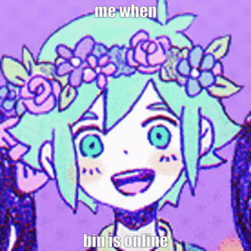 Контентын тайлбар: a cartoon of a girl with a flower crown on her head and the words me when bin is online