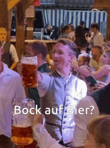 Контентын тайлбар: a man is holding up a glass of beer with the words " bock auf bier " below him