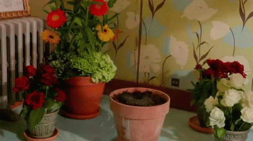 Контентын тайлбар: several potted flowers are on a table in front of a floral wallpaper