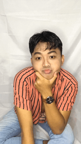 Контентын тайлбар: a young man wearing a watch and a striped shirt is making a funny face