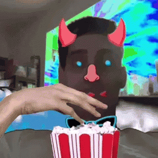 Контентын тайлбар: a pixelated image of a man with devil horns on his face eating popcorn