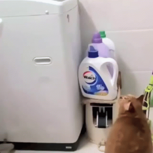 Контентын тайлбар: a cat is sitting next to a bottle of walch detergent