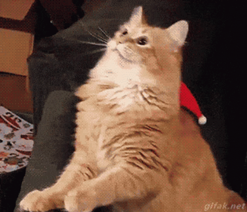 Контентын тайлбар: a cat is wearing a santa hat and sitting on a couch