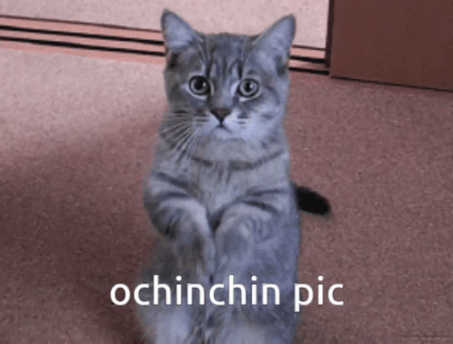 Контентын тайлбар: a cat sitting on its hind legs with the words ochinchin pic written below it