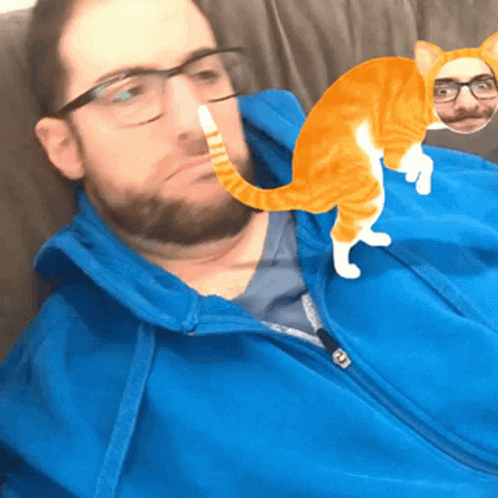 Контентын тайлбар: a man wearing glasses and a blue jacket is holding an orange cat on his shoulder