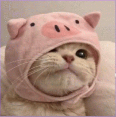 Контентын тайлбар: a cat wearing a pink pig hat looks at the camera .
