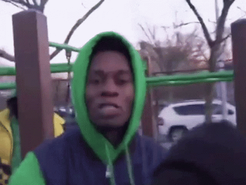 Контентын тайлбар: a man wearing a green hoodie is standing in front of a playground