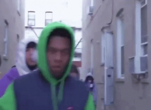 Контентын тайлбар: a man in a green hoodie is walking down a narrow street .