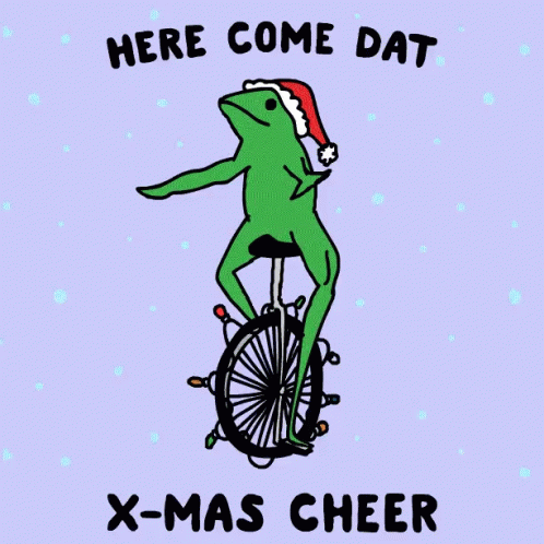 Контентын тайлбар: a frog wearing a santa hat is on a unicycle with the words here come dat x-mas cheer below it