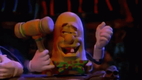 Контентын тайлбар: a cartoon character is holding two hammers in his hands and laughing .