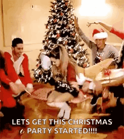 Контентын тайлбар: a group of people dancing in front of a christmas tree .