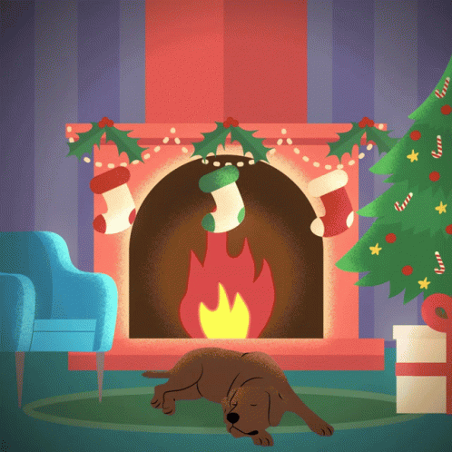Контентын тайлбар: a dog laying in front of a fireplace with christmas stockings on it