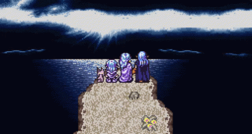 Контентын тайлбар: a pixel art of a group of people sitting on a cliff overlooking the ocean