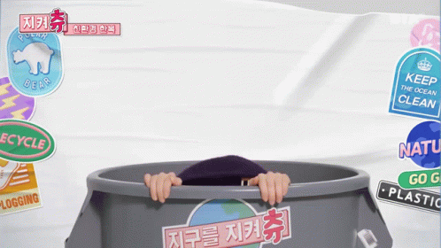 - Контентын тайлбар: a person is sticking their head out of a recycling bin surrounded by stickers including one that says keep the ocean clean
