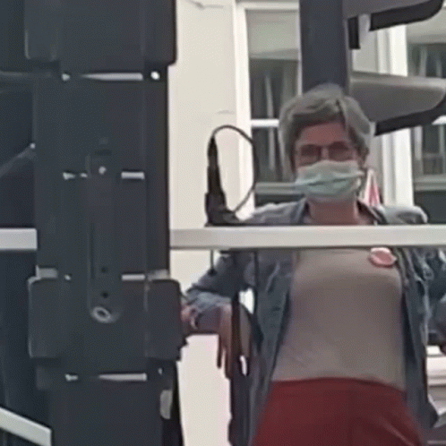Контентын тайлбар: a woman wearing a face mask and glasses is standing in front of a fence .