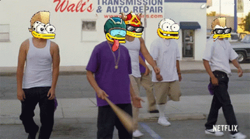 Контентын тайлбар: a group of men walking down a street in front of a walt 's transmission and auto repair store