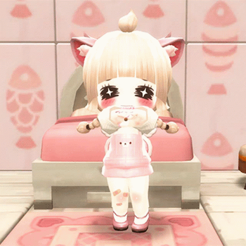 Контентын тайлбар: a cartoon girl is sitting on a pink chair with a fish pattern on the wall behind her