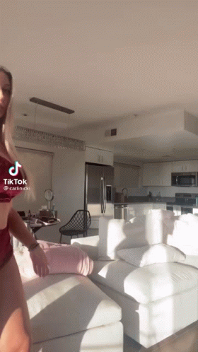Контентын тайлбар: a woman is standing in a living room with a couch and a kitchen in the background .