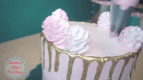 Контентын тайлбар: a cake with pink and white frosting and gold drips from adelia 's cakes