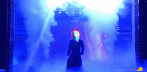 Контентын тайлбар: a man in a red cape is walking through a smokey tunnel