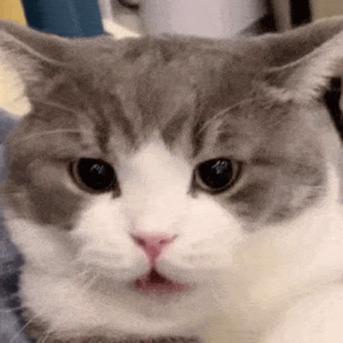 Контентын тайлбар: a close up of a gray and white cat 's face with its mouth open .