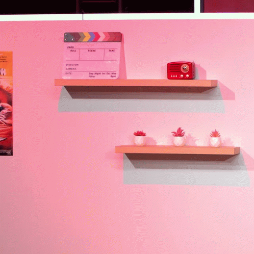 Контентын тайлбар: a pink wall with shelves and a clapper board that says take