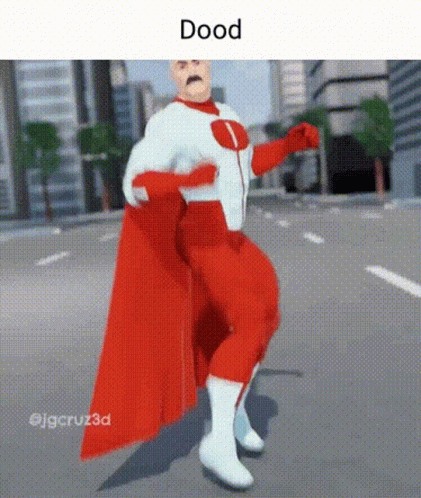 Контентын тайлбар: a man in a red and white superhero costume is walking down a street with a caption that says dood