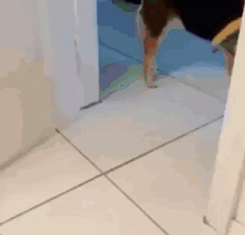 Контентын тайлбар: a dog is standing on a tiled floor in front of a door