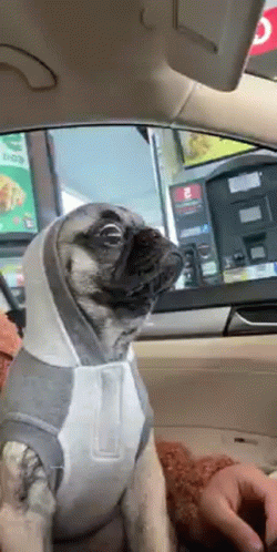 Контентын тайлбар: a pug dog is wearing a hoodie while sitting in a car .