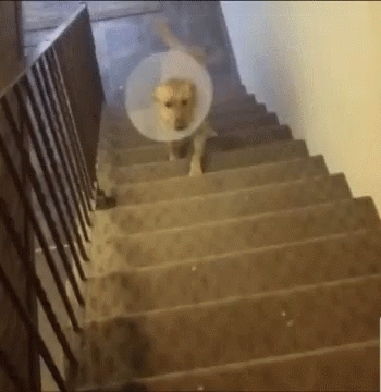 Контентын тайлбар: a dog wearing a cone is walking down stairs .