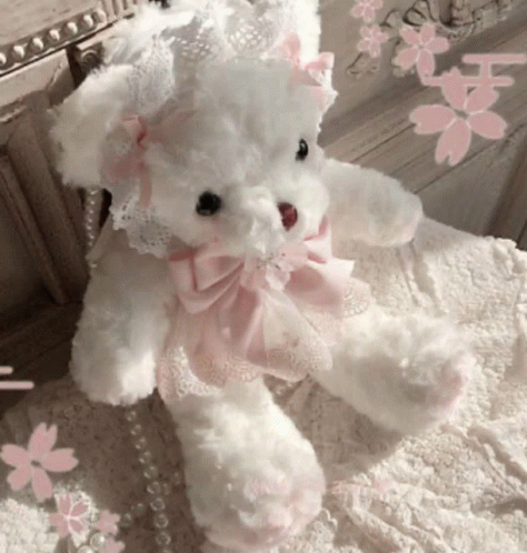Контентын тайлбар: a white teddy bear with a pink bow and pearls