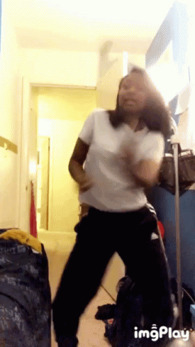 Контентын тайлбар: a woman in a white shirt and black pants is dancing in a room with imgplay written on the bottom