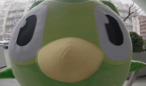 Контентын тайлбар: a green frog mascot with a yellow beak and large eyes