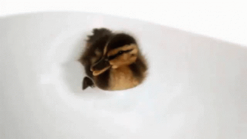 Контентын тайлбар: a baby duck is swimming in a bathtub with its tongue out .