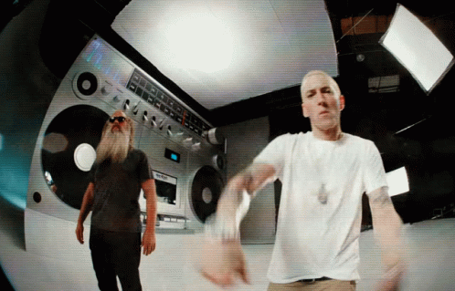 Контентын тайлбар: a man in a white shirt is dancing in front of a boombox that says eminem