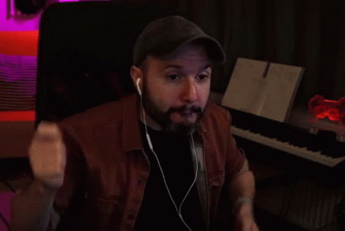 Контентын тайлбар: a man with a beard wearing ear buds and a hat is pointing at the camera