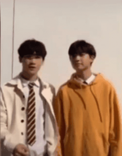 Контентын тайлбар: two young men are standing next to each other in front of a white wall .
