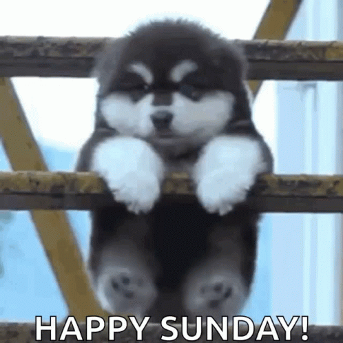 Контентын тайлбар: a husky puppy is hanging on a railing with the words `` happy sunday '' written below it .