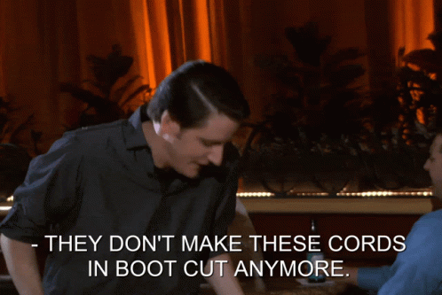 Контентын тайлбар: a man in a black shirt says they do n't make these cords in boot cut anymore on a screen
