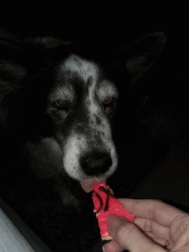 Контентын тайлбар: a black and white dog is being fed a piece of red candy