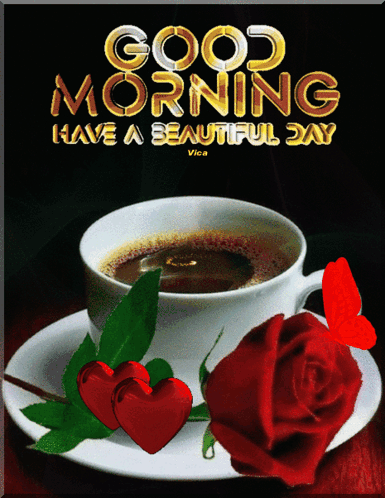 Контентын тайлбар: a picture of a cup of coffee and a rose with the words good morning have a beautiful day on it