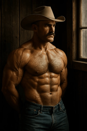 Контентын тайлбар: a shirtless man wearing a cowboy hat and jeans is standing in front of a window