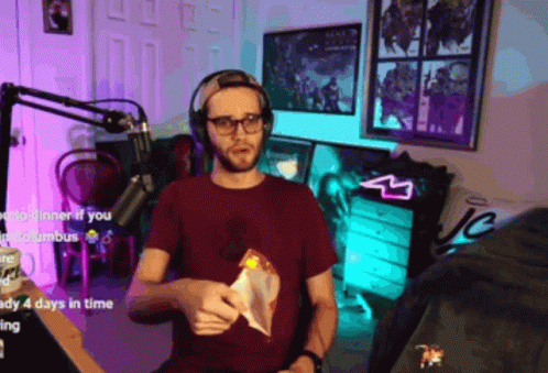 Контентын тайлбар: a man wearing headphones holds a bag of food in front of a microphone