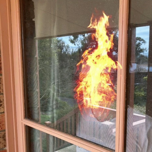 Контентын тайлбар: a window with flames coming out of it and a reflection of trees