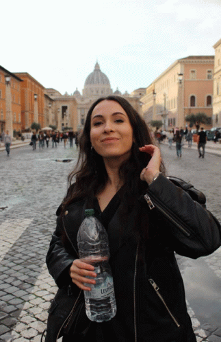 Контентын тайлбар: a woman in a black leather jacket holds a bottle of l' acqua in her hand