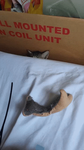 Контентын тайлбар: a cat is peeking out from behind a cardboard box that says " all mounted n coil unit "
