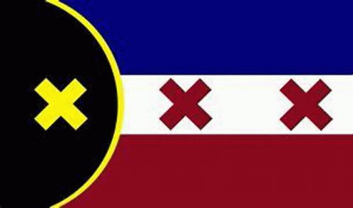 Контентын тайлбар: a flag with three crosses on it and a black circle with a yellow x in the middle .